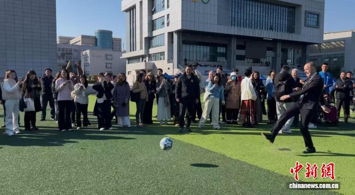 19日,在南京参加“2025世界市长对话·南京”活动的世界各城市嘉宾走进南京市雨花台中学足球场,与雨花台中学校队学生守门员“过招”。中新网记者 朱晓颖 摄