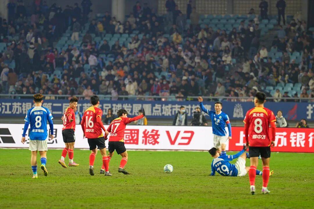 伴随着裁判的哨声划破天际,所有的期待瞬间化作绿茵场上的刀光剑影。双方从第一分钟起便毫无保留,高速的攻防转换与激烈的身体对抗,让比赛始终维持在极高的强度。看台上,红色的浪潮与蓝色的海洋泾渭分明又相互交融。印有“为宁而战”的蓝色战旗猎猎作响,与火红的“苏州定胜”旗帜交相辉映。呐喊声、战歌声、擂鼓声此起彼伏,贯穿了比赛的每一分钟。那一次次因“人浪”而翻滚的看台,成为了寒夜里最动人、最温暖的绿茵风景,也无声地诠释了何为“足球热土”——这里,有最可爱的球迷、最纯粹的热爱。