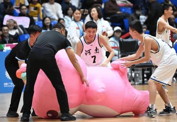 12月14日,河南队球员在比赛间隙和吉祥物“乐融融”互动。新华社记者 邓华 摄