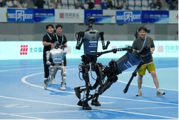 8月17日,在世界人形机器人运动会4x100米接力决赛中,来自天工队(前右)的人形机器人在交接棒时摔倒。新华社记者 鞠焕宗 摄