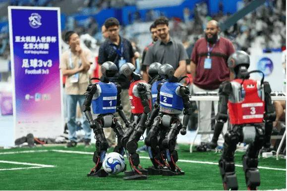 8月15日,来自KURA队的人形机器人(左一)和RoboFEI队的人形机器人在3V3足球比赛中。新华社记者 鞠焕宗 摄
