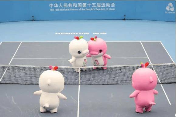 11月12日,第十五届全国运动会吉祥物“喜洋洋”“乐融融”在网球比赛间隙表演。新华社记者 张晨霖 摄