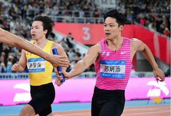 11月20日,广东队选手苏炳添(右)在比赛中。当日,第十五届全国运动会田径项目男子4X100米接力决赛在广州举行。新华社记者 江汉 摄