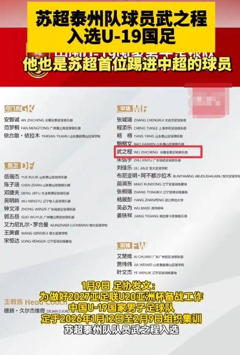 更让人惊喜的是,泰州队的武之程还在1月9日直接入选了U19国足集训名单。
