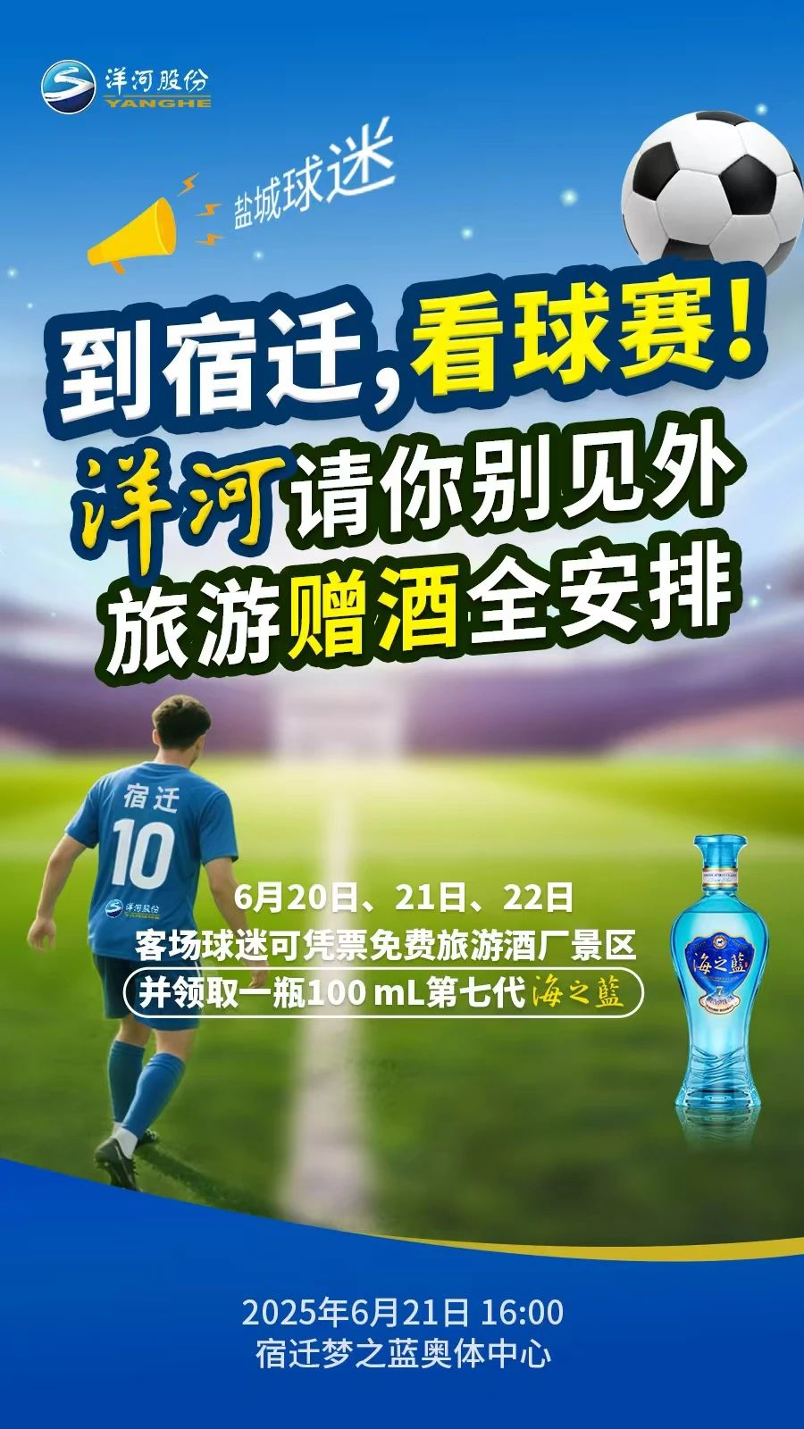 为比赛打Call,将福利拉满。6月21日,梦之蓝·奥体中心将迎来精彩对决——宿迁洋河股份队主场迎战盐城队。洋河股份向盐城球迷推出“旅游+赠酒”的专属礼遇,以“主场礼遇+福利矩阵”与江苏球迷共赴足球梦想的新起点。